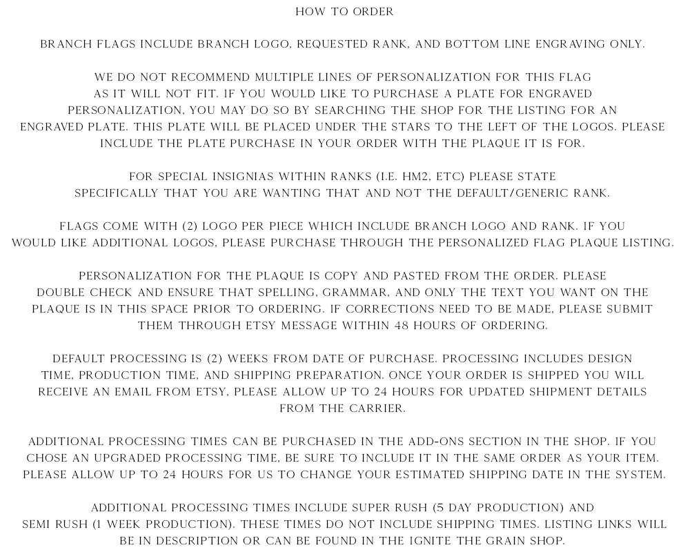 Flags come with (2) logo per piece which include branch logo and rank. If you would like additional logos, please purchase through the Personalized Flag Plaque listing.