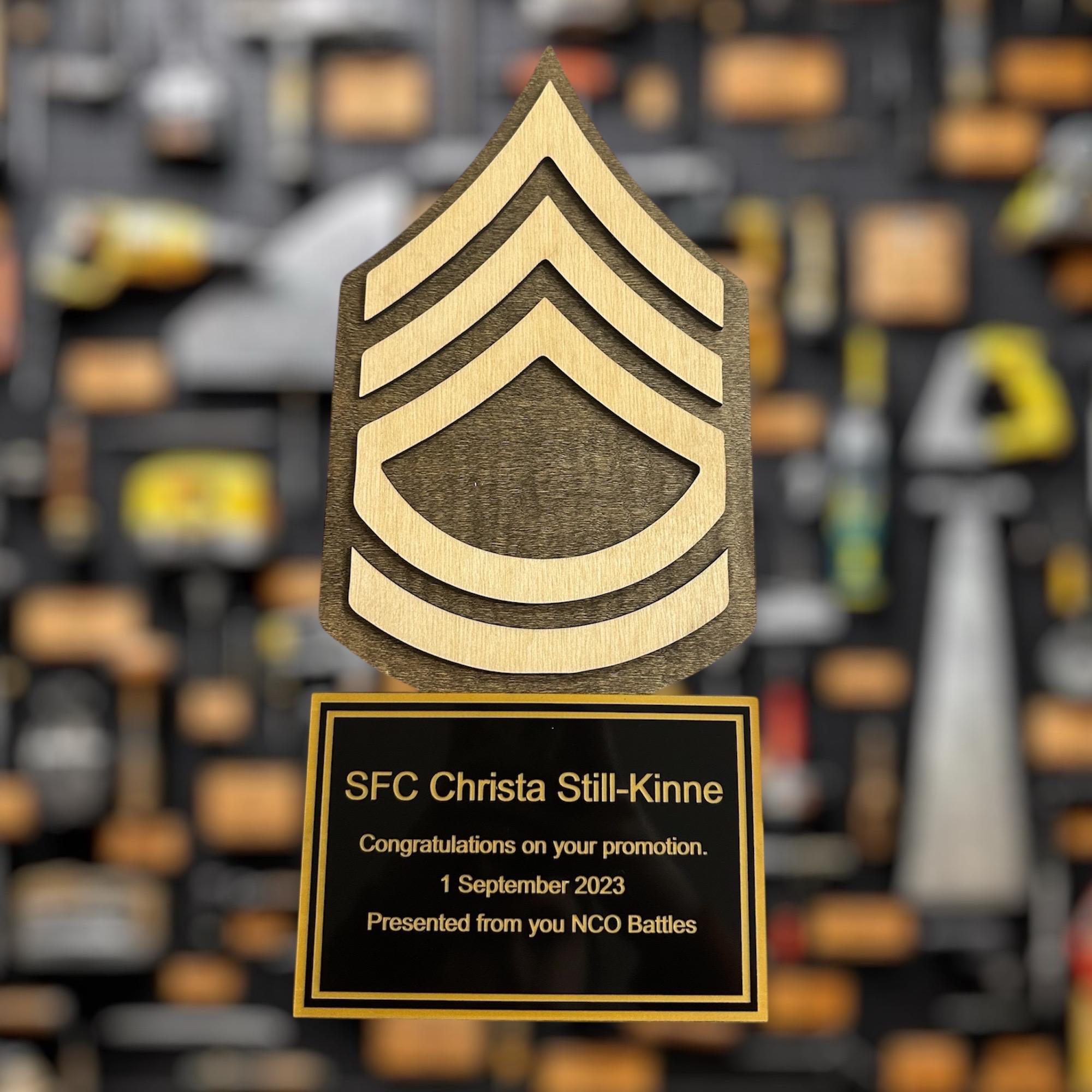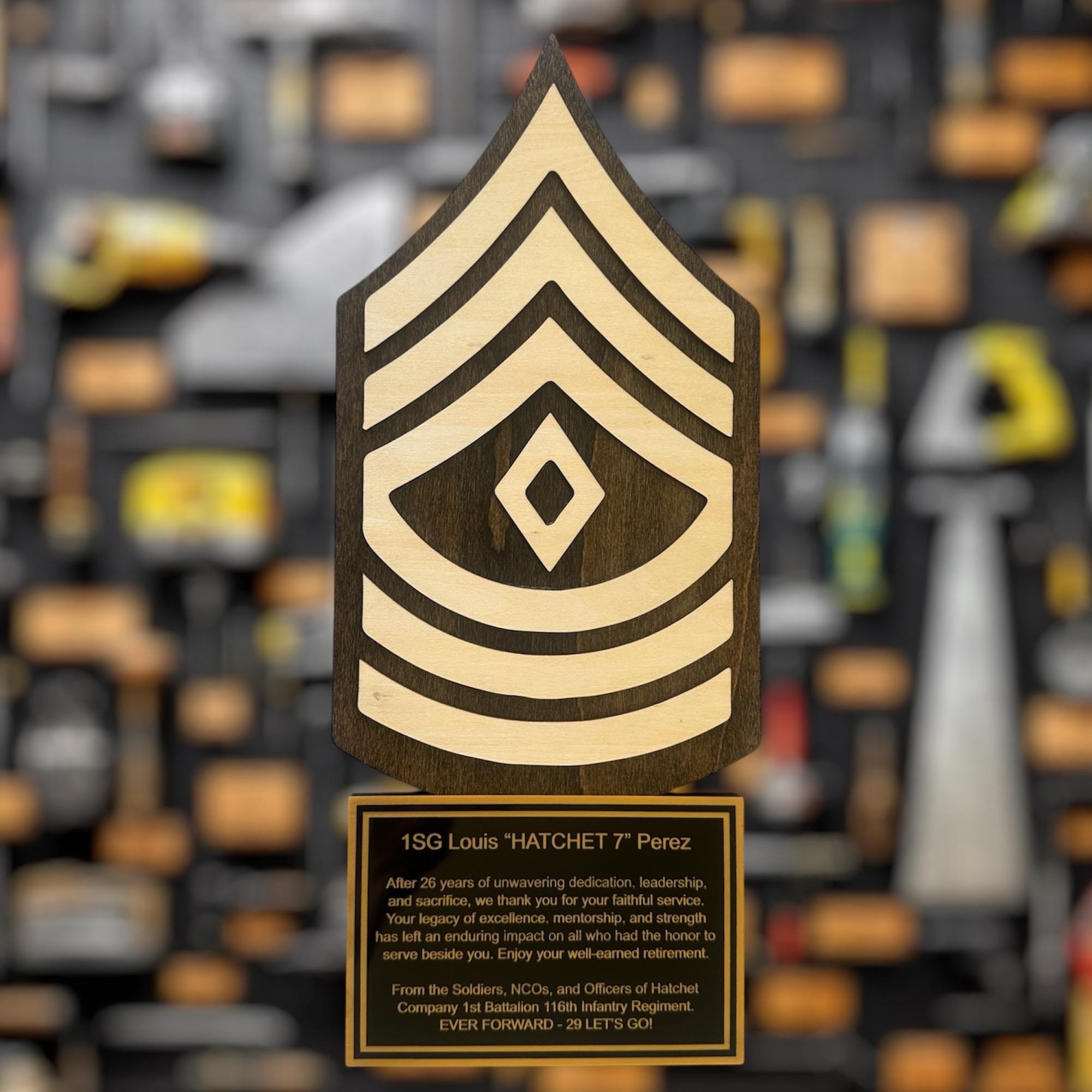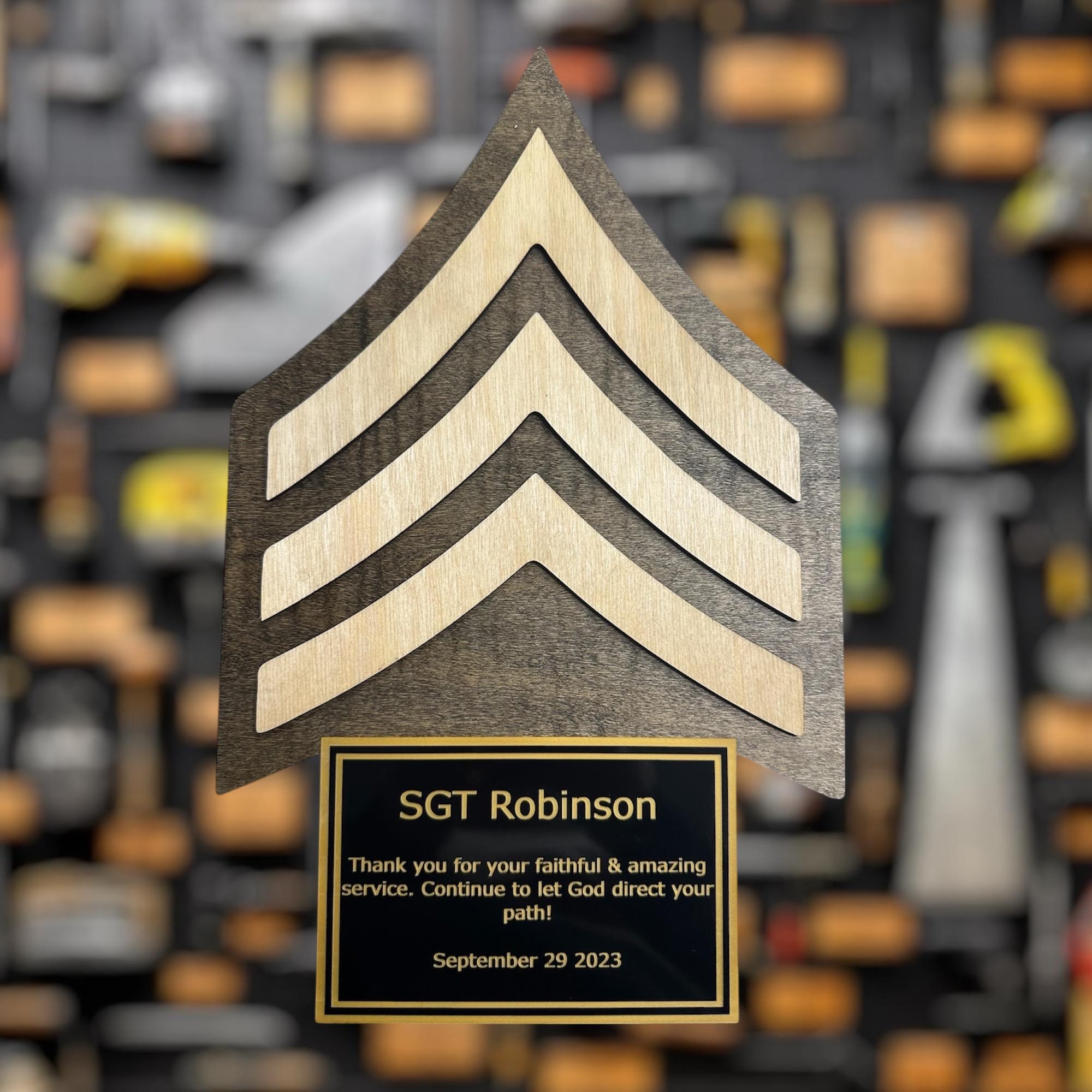 I would recommend this company 10/10. I honestly didn’t think the material would be what it was, so when i opened it, i was even more shocked and happy with my purchase. Plaque is sturdy, & looks very clean. Thank you so much for this amazing product. My bf loved it as his sergeant gift!