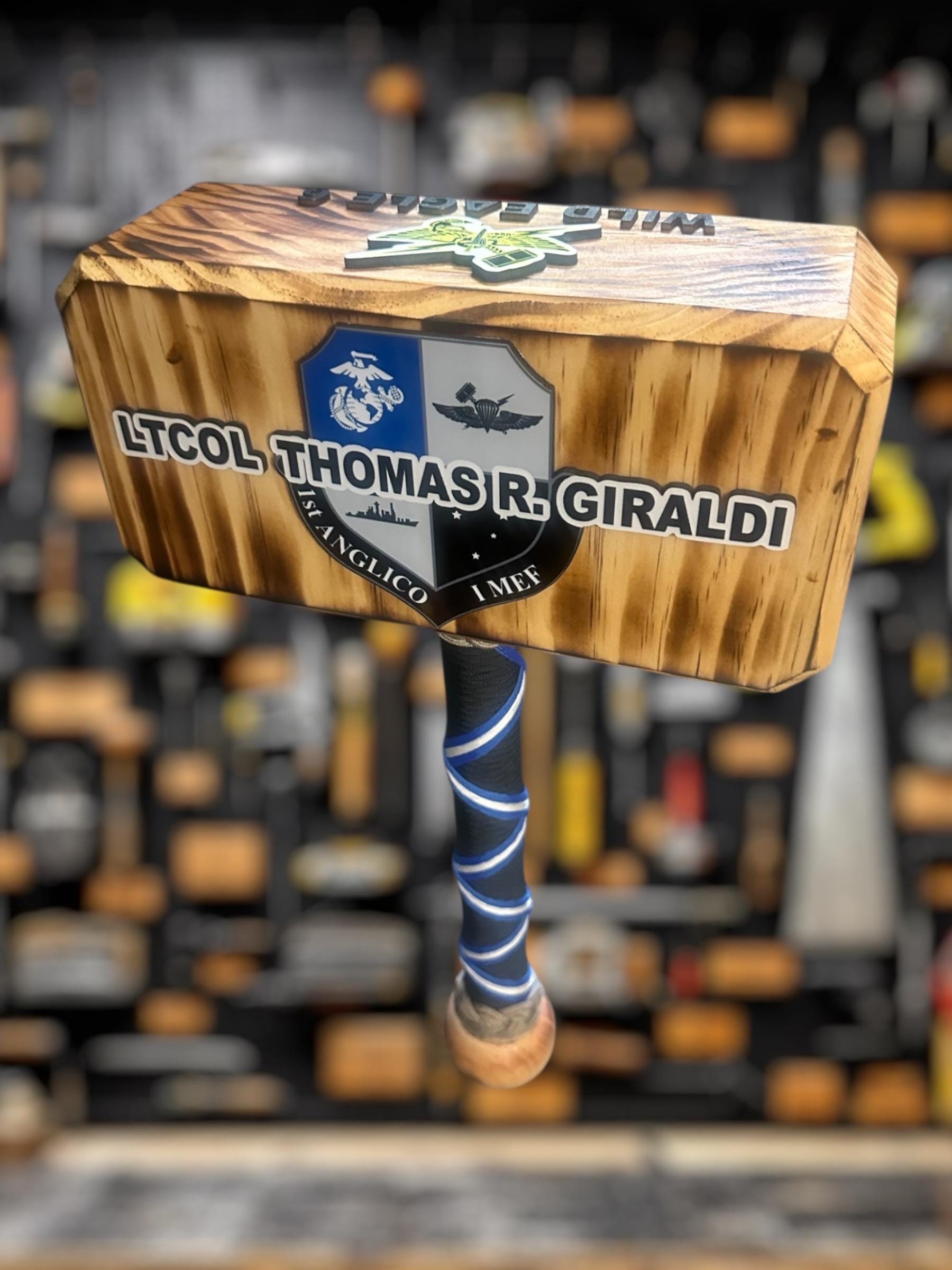 Hammer head is 12" x 3". Front of head will have the rank with the name layered on top. Back will be engraved acrylic to allow for personalization.