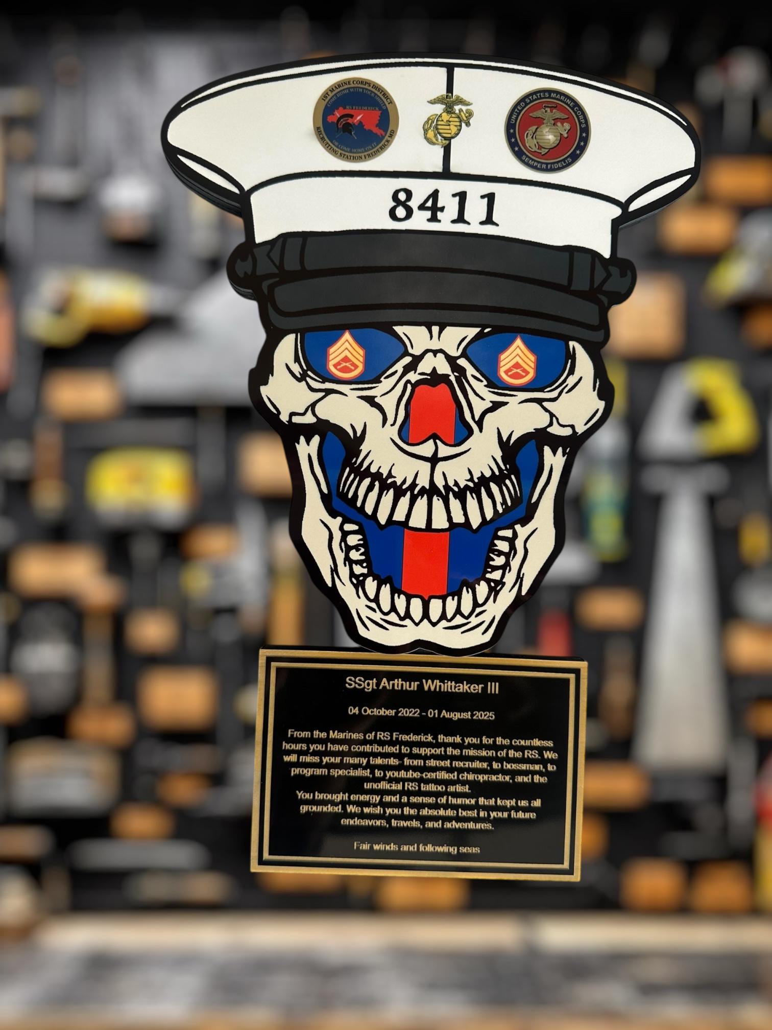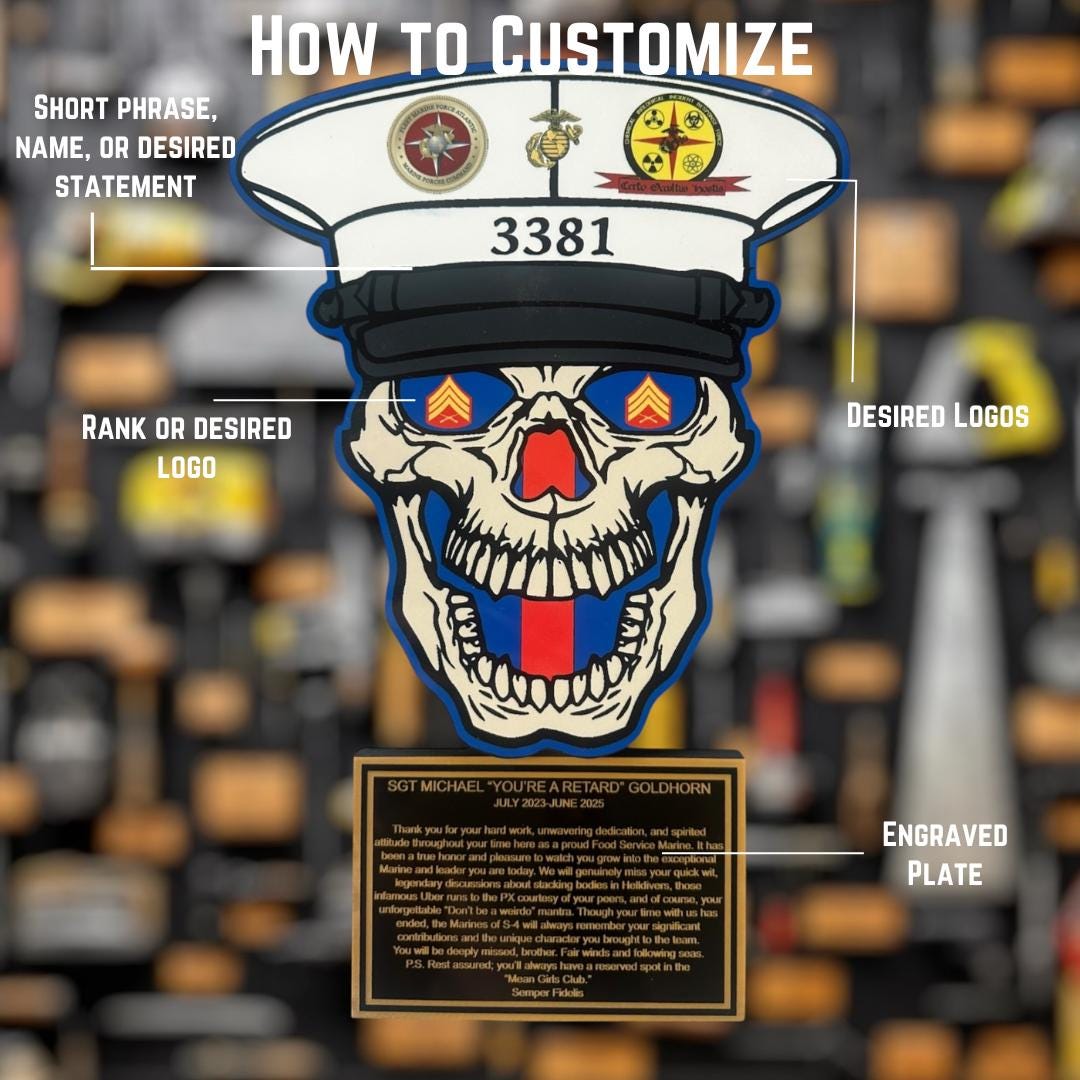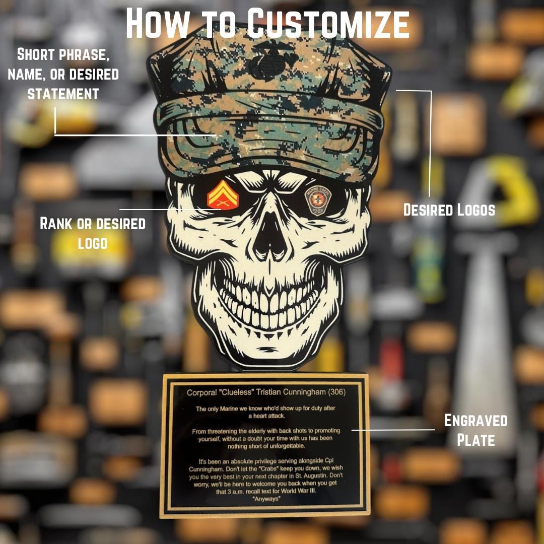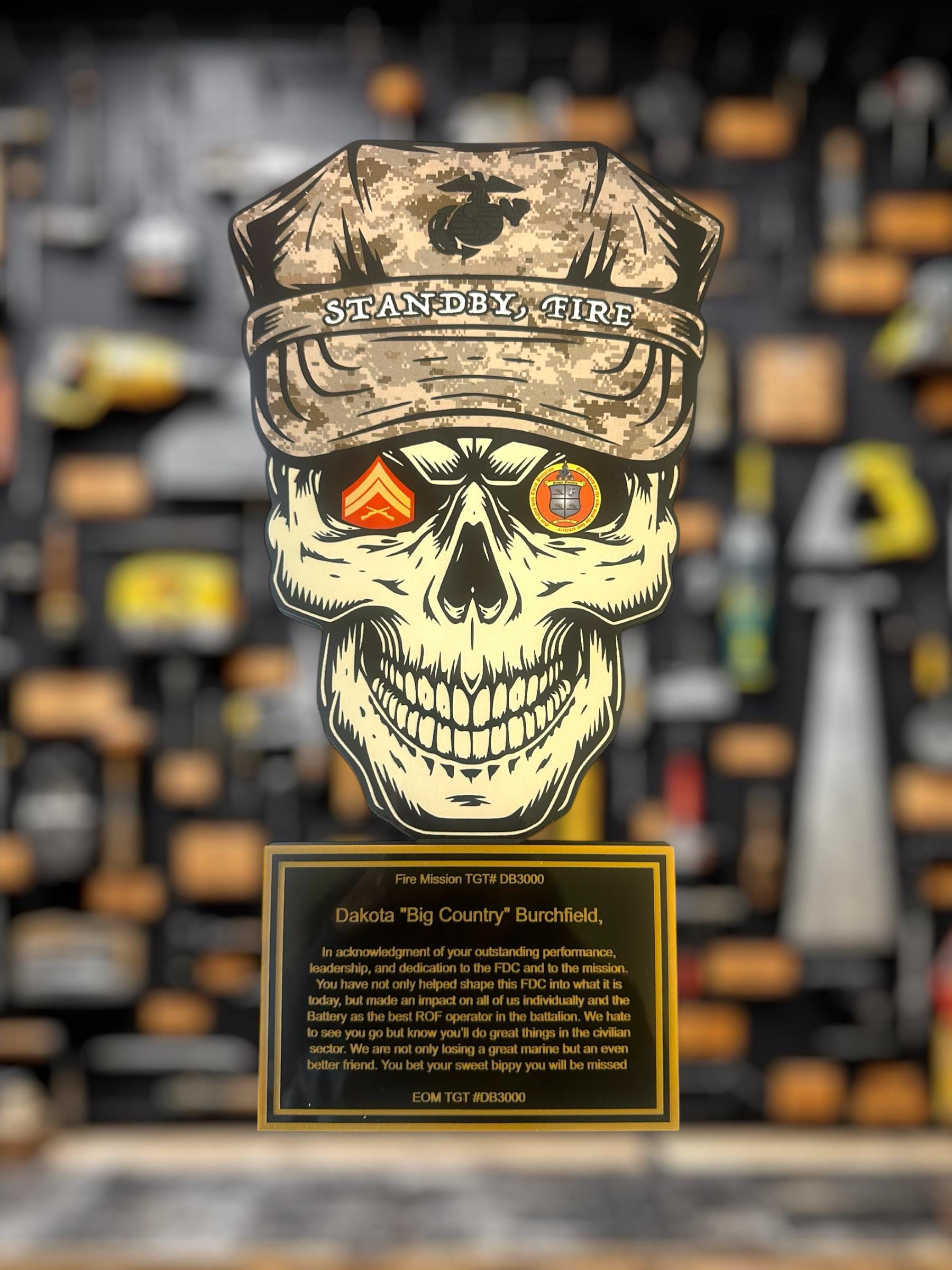 Personalized colorful sublimated skull plaque for military PCS, military promotion, retirement, military change of command, quarterly or yearly recognition, or any military event. Perfect for that crayon eater to embellish their achievements.