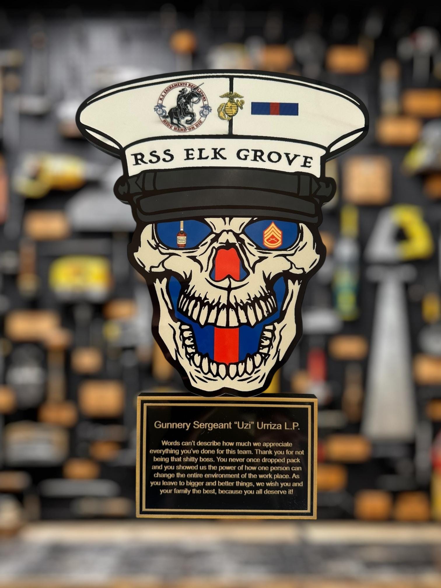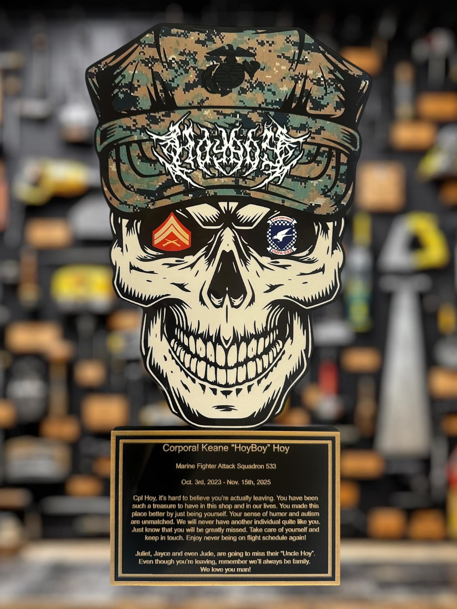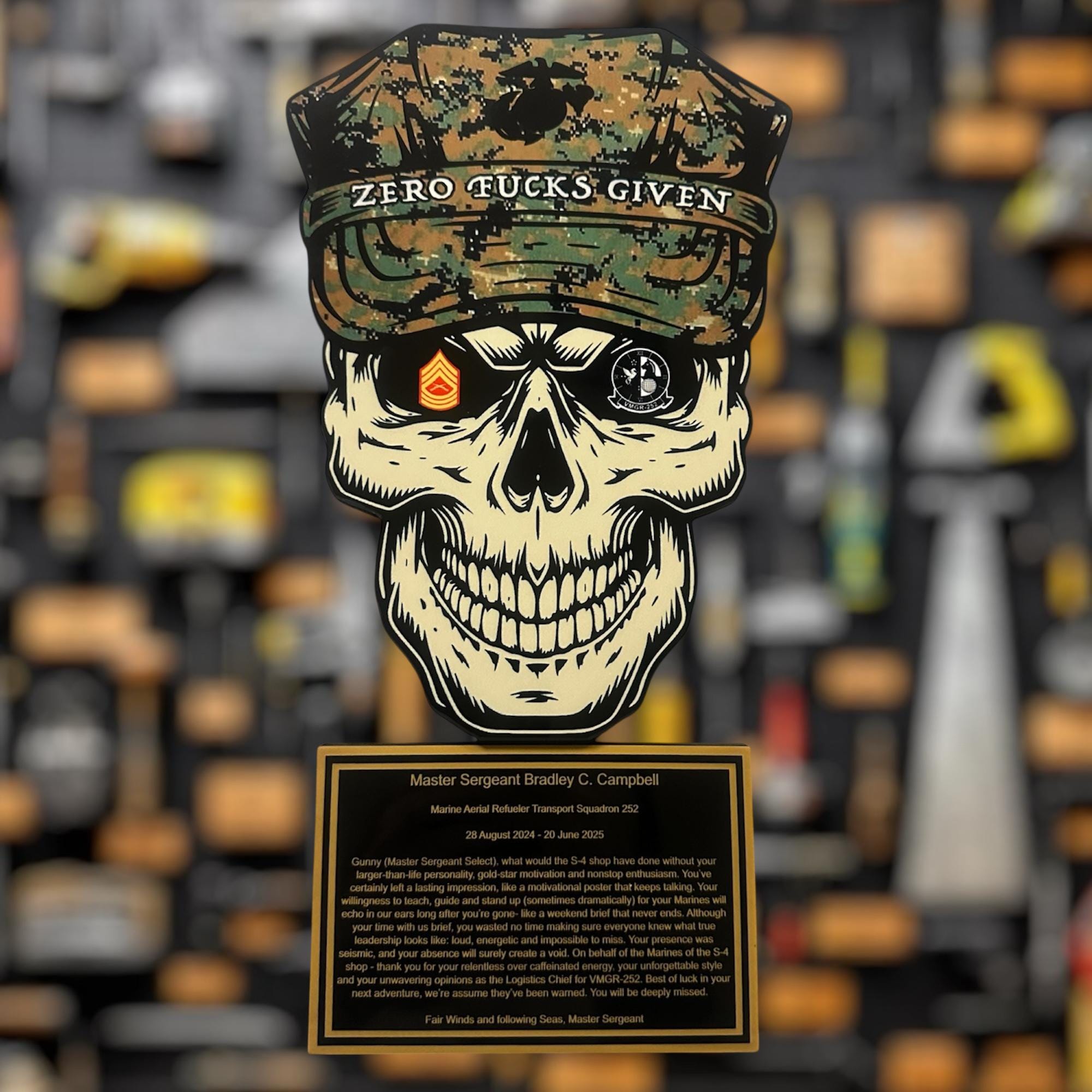 Personalized colorful sublimated skull plaque for military PCS, military promotion, retirement, military change of command, quarterly or yearly recognition, or any military event. Perfect for that crayon eater to embellish their achievements.