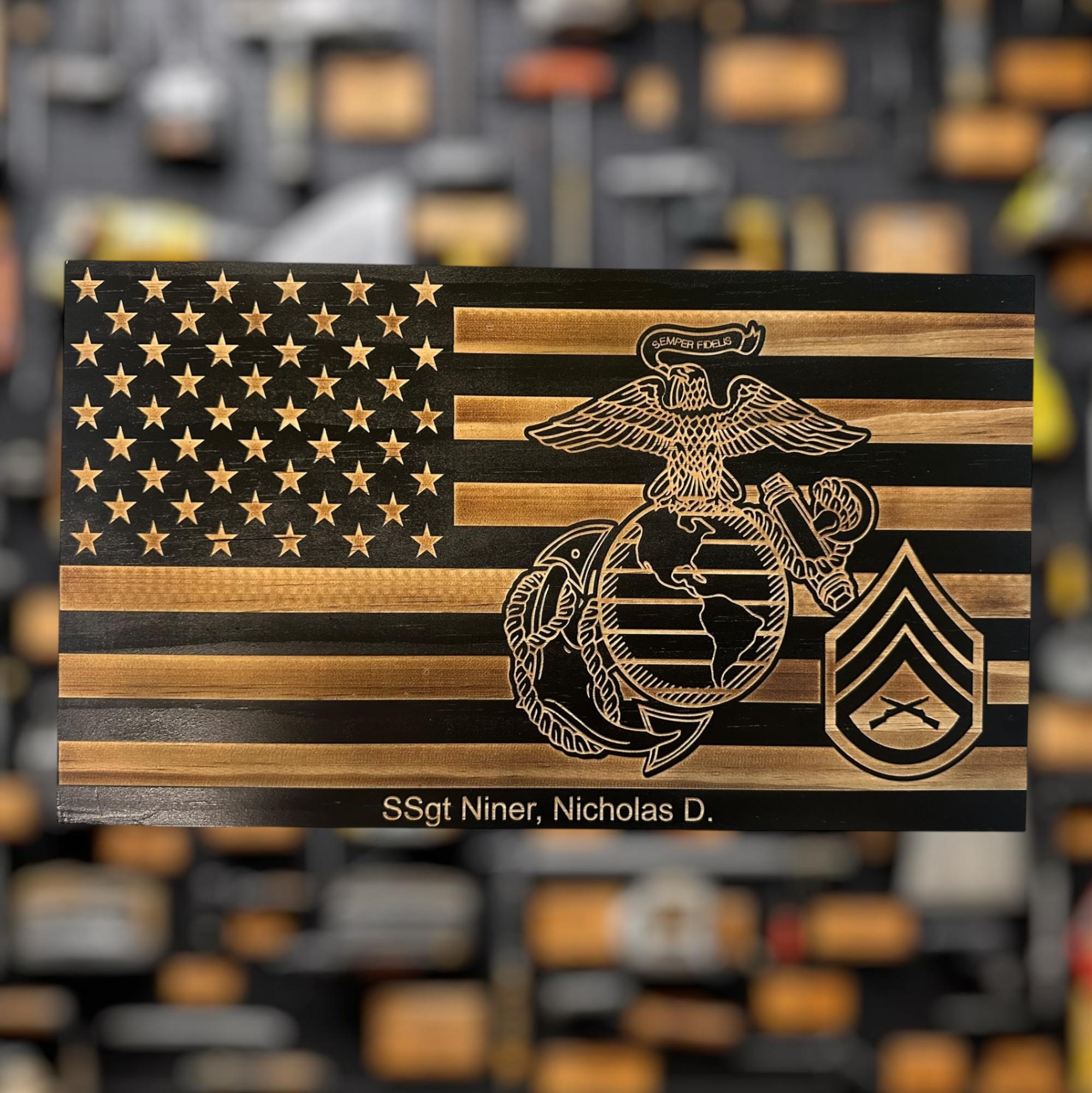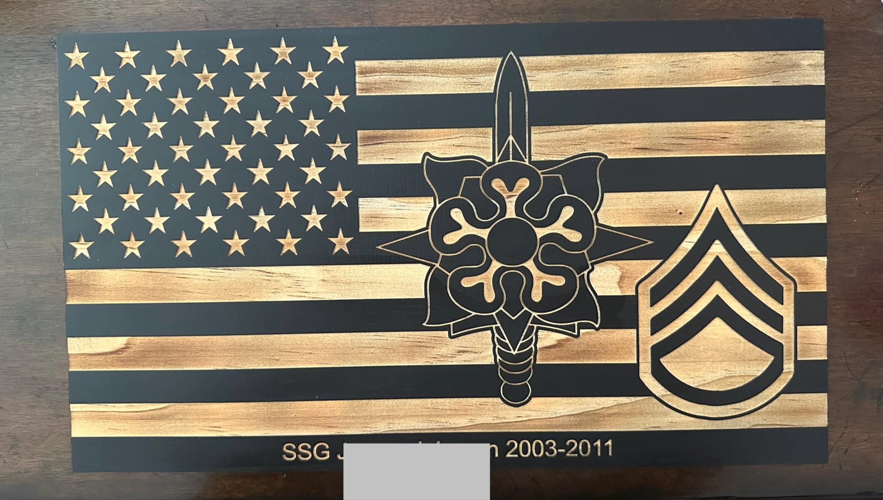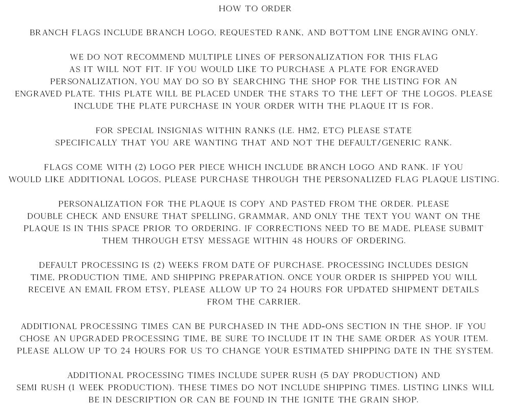 Flags come with (2) logo per piece which include branch logo and rank. If you would like additional logos, please purchase through the Personalized Flag Plaque listing.